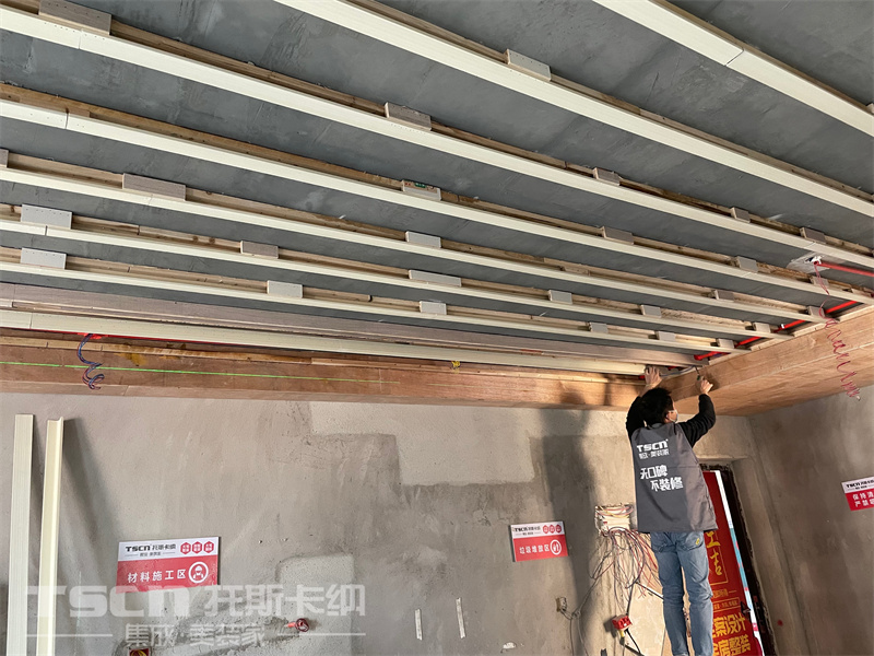 這是一套樣板房施工現(xiàn)場,施工物料的布置、頂面龍骨打底的施工場景嚴格按照公司標準,以確保裝修過程的整潔無錯漏。1、材料標識貼,按標準堆放物料。2.工人按要求穿戴工作服,不抽煙不亂扔垃圾。3.粉塵環(huán)境,佩戴口罩,保護健康。4.按標準打龍骨,龍骨之間距20CM。